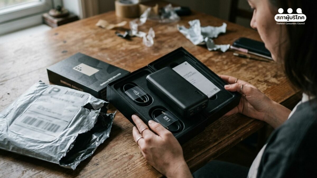 – อีกกรณีหนึ่งสะท้อนความเสียหายที่รุนแรงขึ้น เมื่อผู้บริโภคโอนเงินสั่งซื้อโทรศัพท์มือถือ Samsung Galaxy S25 Plus มือสอง ในราคา 7,500 บาท แต่กลับได้รับ พาวเวอร์แบงก์ สอดไส้แทนสินค้า
