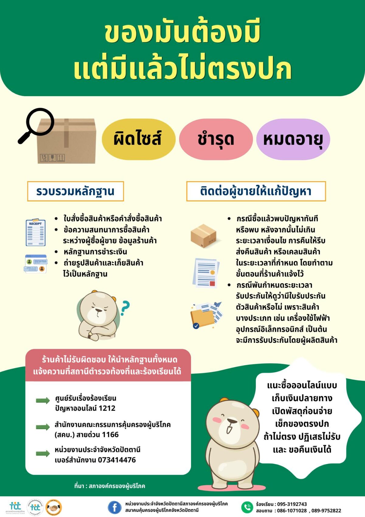 ปัญหาซื้อของออนไลน์ยังคงเป็นจุดเสี่ยงซ้ำซากของผู้บริโภคไทย โดยเฉพาะการซื้อผ่าน เฟซบุ๊ก ซึ่งกลายเป็นช่องทางที่ผู้บริโภคจำนวนไม่น้อย โดนโกงออนไลน์ ทั้งสินค้าไม่ตรงปก สินค้าชำรุด ได้ของไม่ครบ ไปจนถึงการไม่รับผิดชอบหลังการขาย หน่วยงานประจำจังหวัดปัตตานี จึงเร่งเข้าช่วยเหลือผู้ร้องเรียนอย่างต่อเนื่อง ไม่ใช่เพียงการรับเรื่องเท่านั้น แต่ลงมือประสาน แก้ไข และป้องกัน ผ่านการสื่อสารความรู้เพื่อให้ผู้บริโภครู้เท่าทันก่อนตัดสินใจซื้อ
