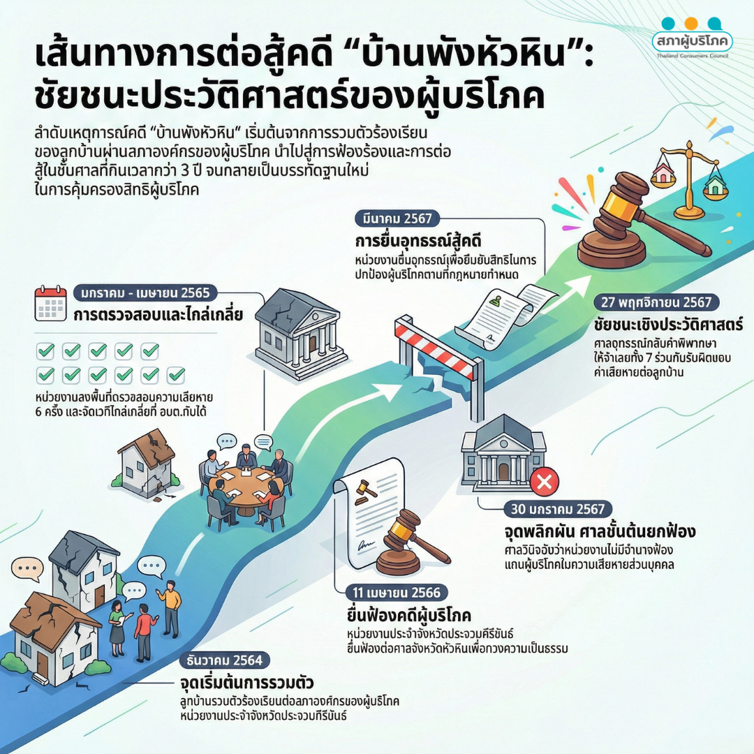 บ้าน คือวิมานในฝันสำหรับใครหลายคน แต่สำหรับลูกบ้านในหมู่บ้านจัดสรรที่อำเภอหัวหิน จังหวัดประจวบคีรีขันธ์ กลับกลายเป็นระเบิดเวลาหลังเข้าอยู่เพียงไม่กี่เดือน นี่คือมหากาพย์การร้องเรียนของผู้บริโภค 14 ราย ที่ต้องเผชิญหน้ากับนายทุนเลี่ยงกฎหมาย จนนำมาสู่ชัยชนะและการเยียวยากว่า 24 ล้านบาท โดยความช่วยเหลือของสภาองค์กรของผู้บริโภค จากหน่วยงานประจำจังหวัดประจวบคีรีขันธ์