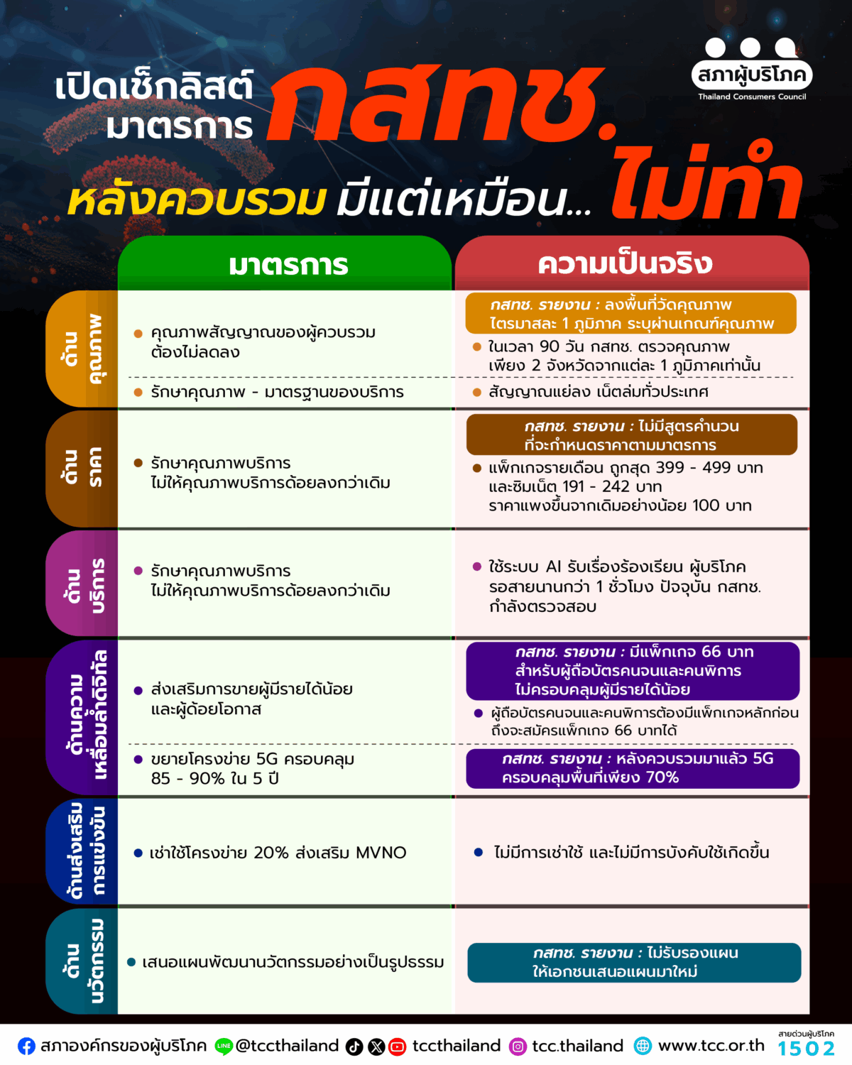 หลังการควบรวม แม้คณะกรรมการกิจการกระจายเสียง กิจการโทรทัศน์ และกิจการโทรคมนาคมแห่งชาติ (กสทช.) จะได้กำหนดมาตรการและเงื่อนไขเฉพาะเพื่อกำกับดูแล แต่ข้อมูลที่สภาผู้บริโภครวบรวมได้ชี้ให้เห็นภาพที่สวนทางกันอย่างสิ้นเชิงระหว่าง “มาตรการของ กสทช.” และ “ความเป็นจริง” ที่ผู้บริโภคต้องเผชิญ เช่น
