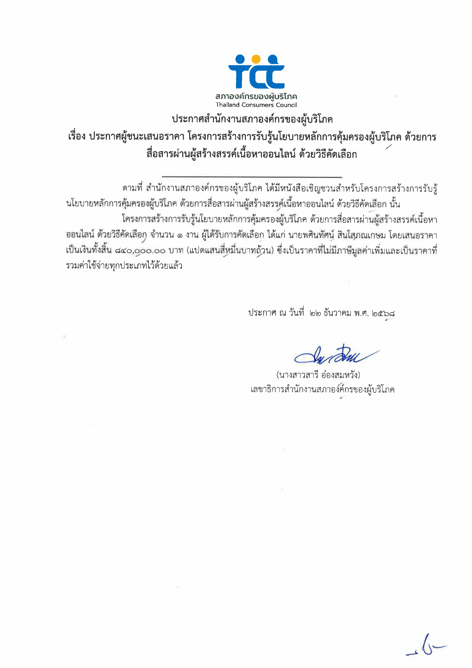 ประกาศผู้ชนะเสนอราคา โครงการสร้างการรับรู้นโยบายหลักการคุ้มครองผู้บริโภค ด้วยการสื่อสารผ่านผู้สร้างสรรค์เนื้อหาออนไลน์ ด้วยวิธีคัดเลือก