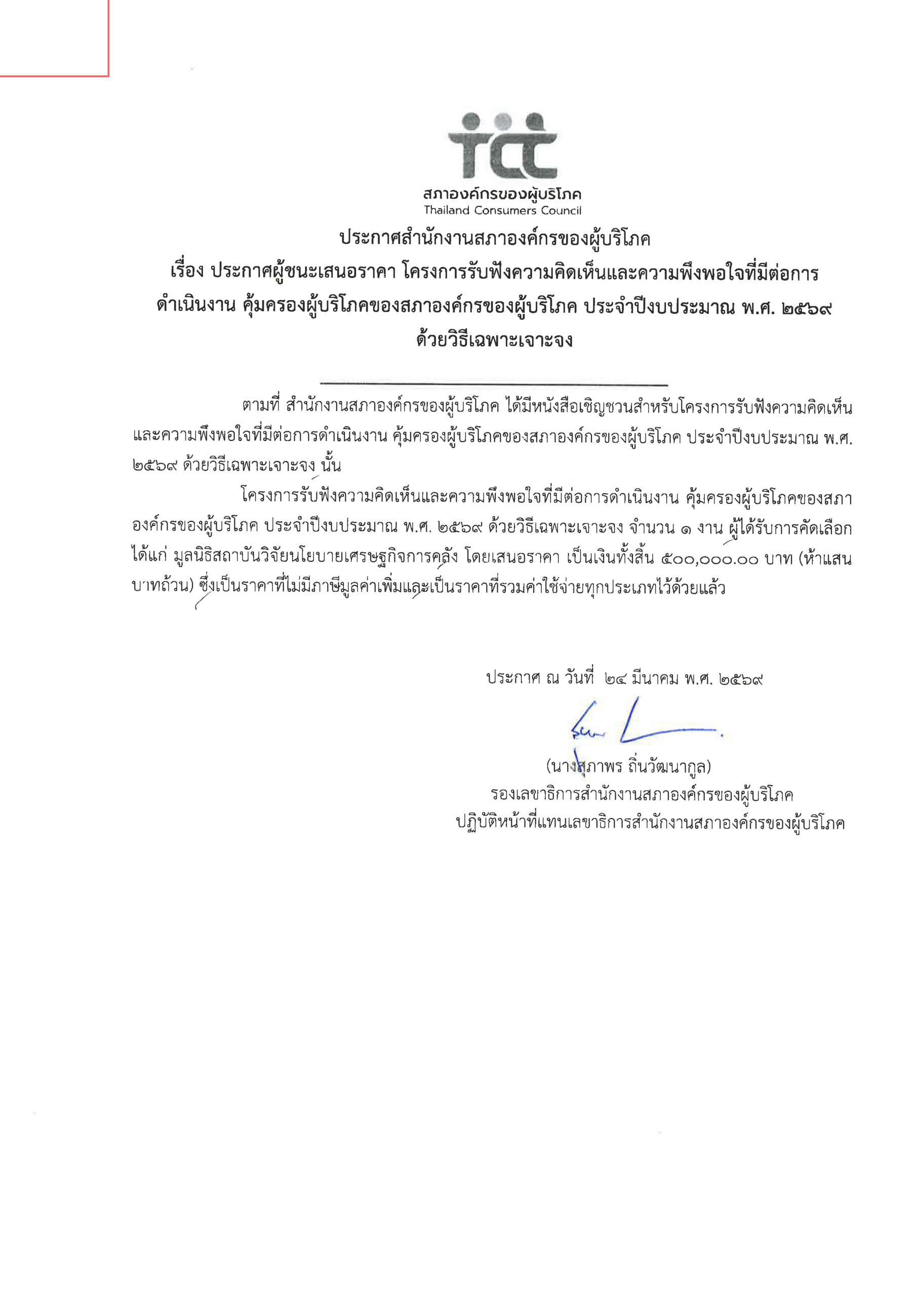 ประกาศผู้ชนะเสนอราคา โครงการรับฟังความคิดเห็นและความพึงพอใจที่มีต่อการดำเนินงาน คุ้มครองผู้บริโภคของสภาองค์กรของผู้บริโภค ประจำปีงบประมาณ พ.ศ. 2569 ด้วยวิธีเฉพาะเจาะจง