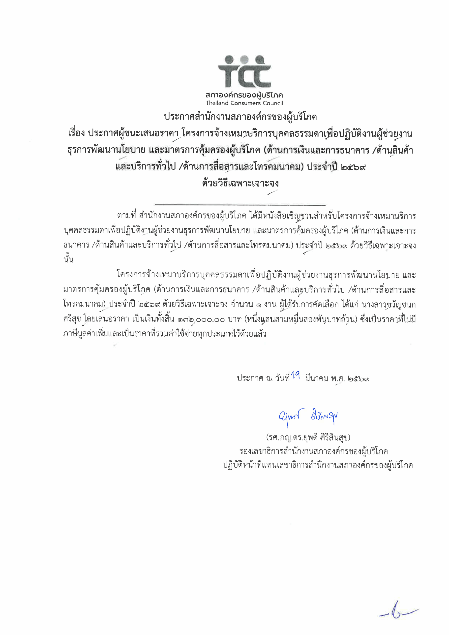 ประกาศสำนักงานสภาองค์กรของผู้บริโภค เรื่อง ประกาศผู้ชนะเสนอราคา โครงการจ้างเหมาบริการบุคคลธรรมดาเพื่อปฏิบัติงานผู้ช่วยงานธุรการพัฒนานโยบาย และมาตรการคุ้มครองผู้บริโภค (ด้านการเงินและการธนาคาร /ด้านสินค้าและบริการทั่วไป /ด้านการสื่อสารและโทรคมนาคม) ประจำปี 2569 ด้วยวิธีเฉพาะเจาะจง