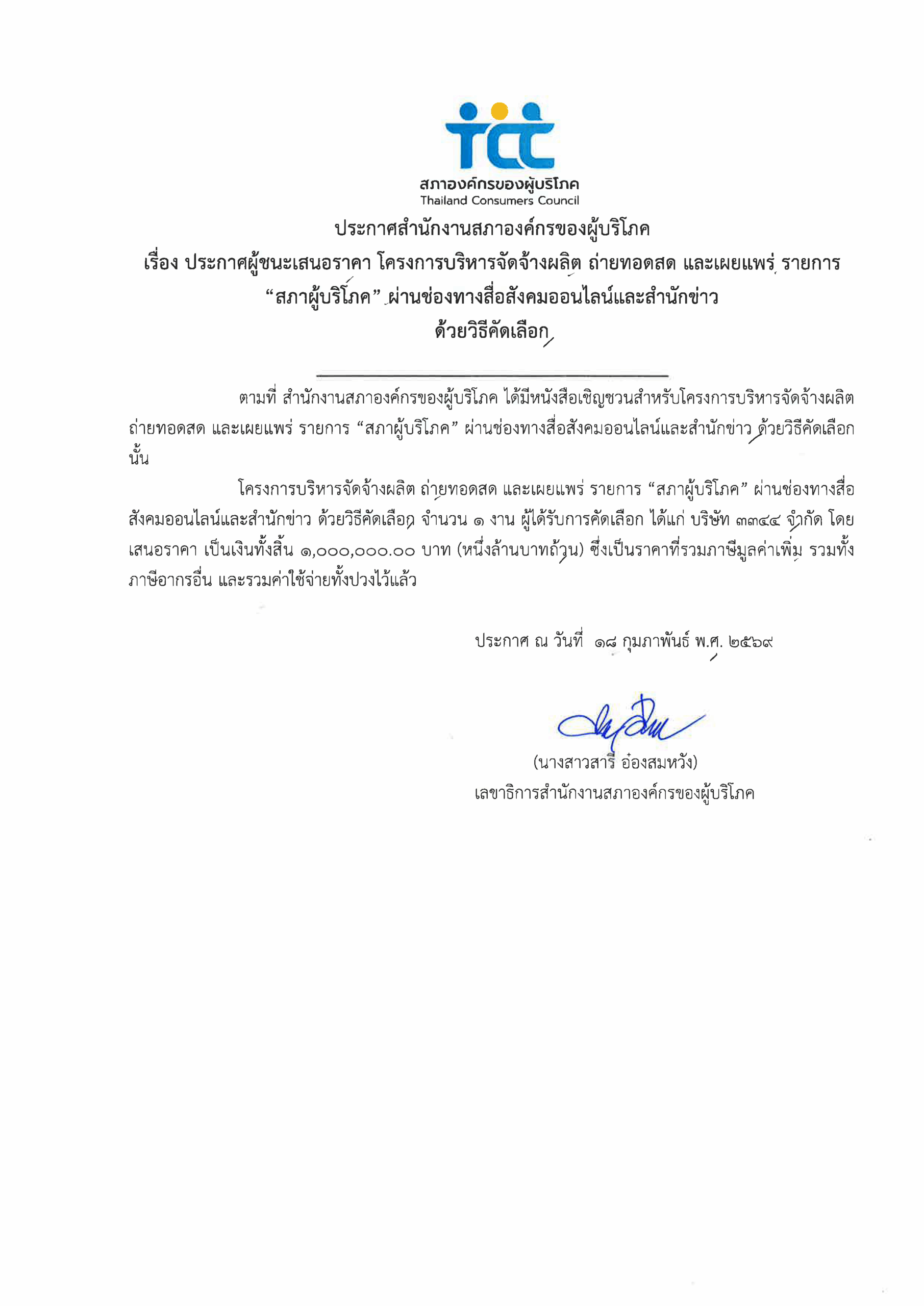 ประกาศผู้ชนะเสนอราคา โครงการบริหารจัดจ้างผลิต ถ่ายทอดสด และเผยแพร่ รายการ “สภาผู้บริโภค” ผ่านช่องทางสื่อสังคมออนไลน์และสำนักข่าว ด้วยวิธีคัดเลือก