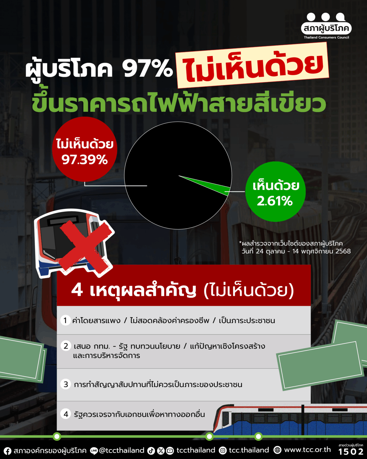 นี่เป็นเพียงความเห็นบางส่วนจากผลสำรวจความคิดเห็นต่อการขึ้นค่าโดยสารรถไฟฟ้าสายสีเขียวส่วนต่อขยาย บนเว็บไซต์สภาผู้บริโภค www.tcc.or.th ตั้งแต่วันที่ 24 ตุลาคม – 14 พฤศจิกายน 2568 โดยจากข้อมูลพบว่าผู้บริโภค ส่วนใหญ่ถึง 97.39% ไม่เห็นด้วยกับการปรับราคา สะท้อนปัญหาเรื่องภาระค่าครองชีพที่กำลังถาโถมต่อครัวเรือนในเมืองใหญ่ โดยเฉพาะผู้ที่ต้องใช้รถไฟฟ้าในชีวิตประจำวัน
