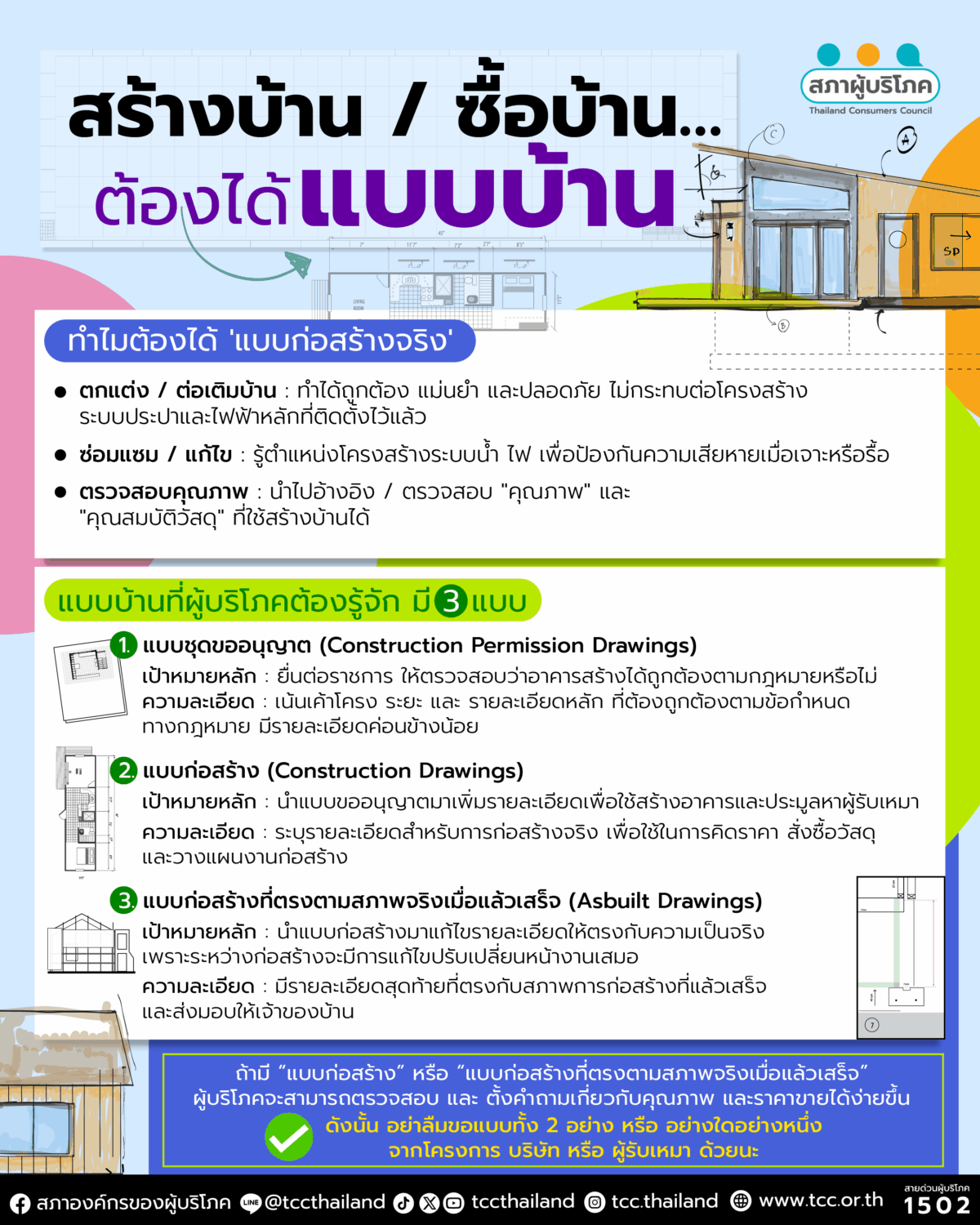 ไม่ว่าจะใช้วิธี ว่าจ้างสถาปนิกมาออกแบบบ้าน ว่าจ้างบริษัทรับสร้างบ้าน หรือ ซื้อบ้านจัดสรรที่สร้างเสร็จก็ตาม ผู้บริโภคมีสิทธิได้รับ “แบบก่อสร้างจริง” เพื่อเป็นกรรมสิทธิ์ และนำไปอ้างอิง ใช้งานต่อไปได้