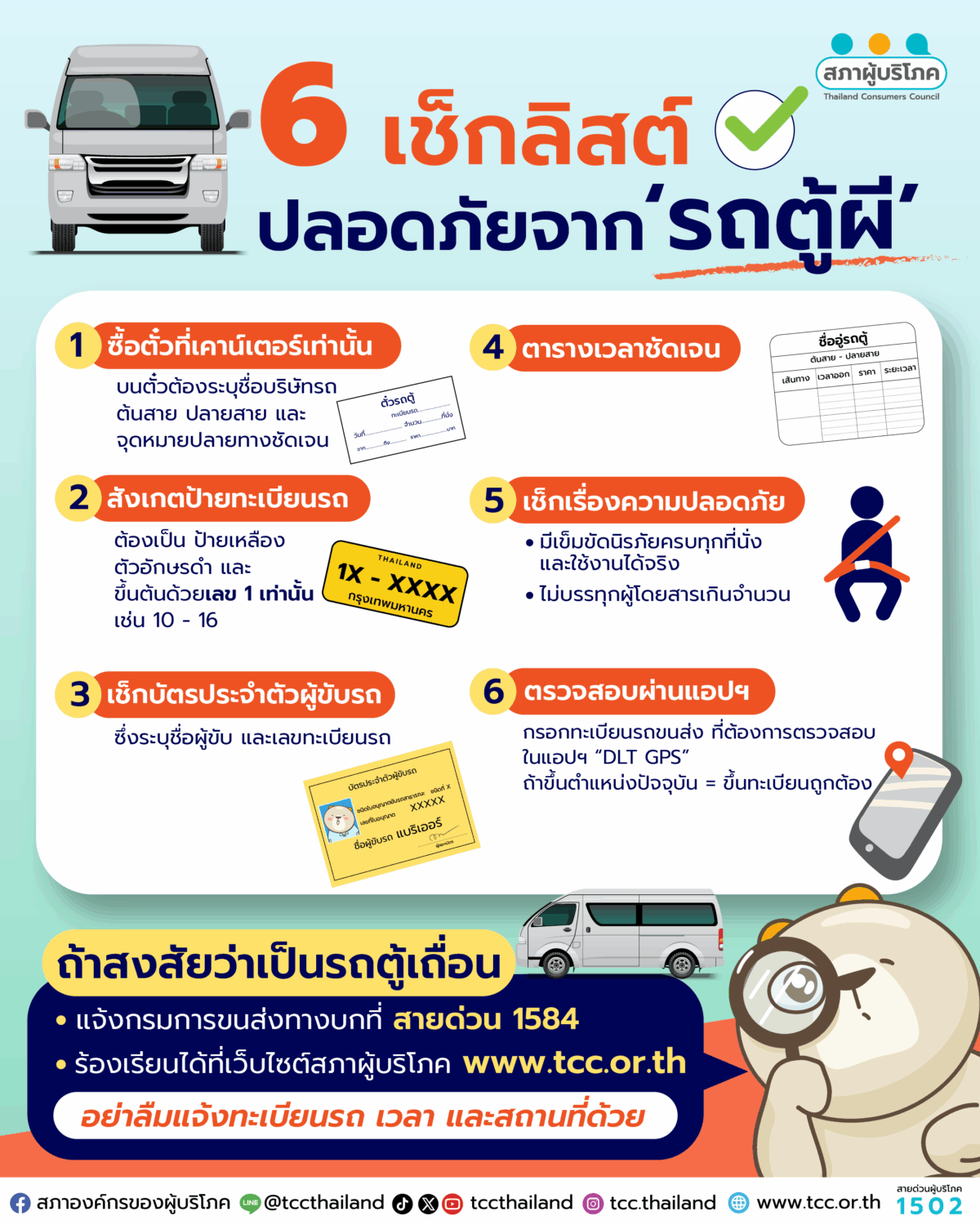 ⚠️ หากสงสัยว่าเป็นรถตู้เถื่อน สามารถแจ้งกรมการขนส่งทางบกผ่าน สายด่วน 1584 พร้อมแจ้งทะเบียนรถ เวลา และสถานที่ หรือร้องเรียนได้ที่เว็บไซต์ของสภาผู้บริโภค www.tcc.or.th