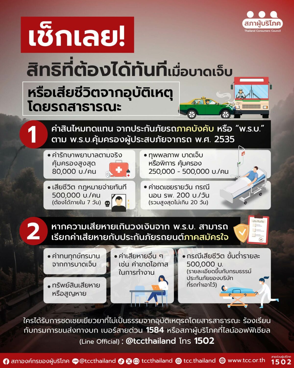 ทั้งนี้ ใครได้รับการชดเชยเยียวยาที่ไม่เป็นธรรมจากอุบัติเหตุรถโดยสารสาธารณะ ร้องเรียนกับกรมการขนส่งทางบก เบอร์สายด่วน 1584 หรือสภาผู้บริโภค ได้ที่
