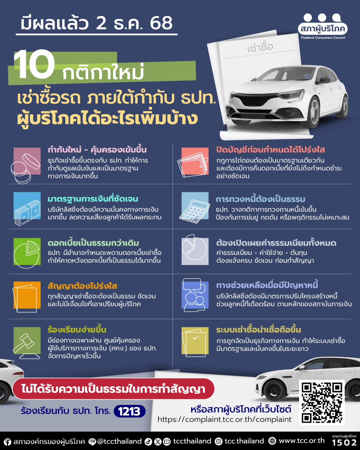 การเปลี่ยนผ่านให้ธุรกิจเช่าซื้ออยู่ภายใต้การกำกับของ ธปท. ไม่เพียงเพิ่มความมั่นคงให้ระบบสินเชื่อรถยนต์ แต่ยังช่วยลดความเสี่ยงที่ผู้บริโภคต้องเผชิญจากสัญญาที่ไม่เป็นธรรมในอดีต หากผู้บริโภคพบว่าไม่ได้รับความเป็นธรรม สามารถร้องเรียนได้ที่ ธปท. โทร. 1213 หรือผ่านเว็บไซต์สภาผู้บริโภค