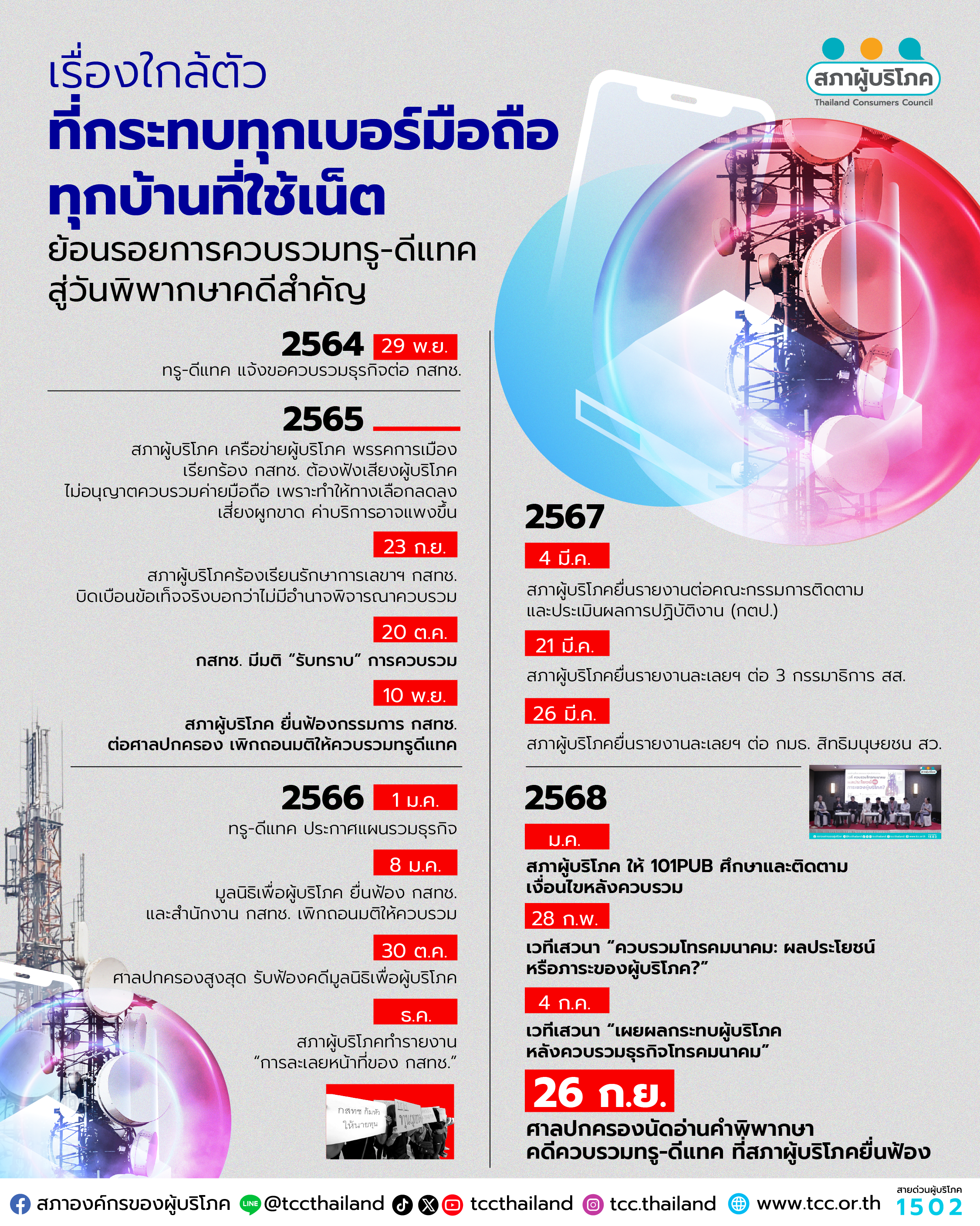 และแล้วในวันที่ 26 กันยายน 2568 ที่จะถึงนี้ ศาลปกครองจะนัดอ่านคำพิพากษาคดีที่สภาผู้บริโภคฟ้องเพิกถอนมติ กสทช. ที่อนุญาตให้ทรูดีแทคควบรวม คดีนี้ถือคดีประวัติศาสตร์ที่ชี้ชะตาสิทธิผู้บริโภคทั้งประเทศ และจะเป็นเครื่องพิสูจน์ว่ากลไกการกำกับดูแลด้านโทรคมนาคมของไทยยังสามารถยืนอยู่ข้างประชาชนได้หรือไม่ ผู้บริโภคทุกคนจึงควรจับตาคำพิพากษาครั้งสำคัญนี้อย่างใกล้ชิด เพราะสุดท้ายแล้วคำตัดสินอาจกำหนดอนาคตของมือถือทุกเบอร์ และเน็ตทุกบ้านในประเทศไทย